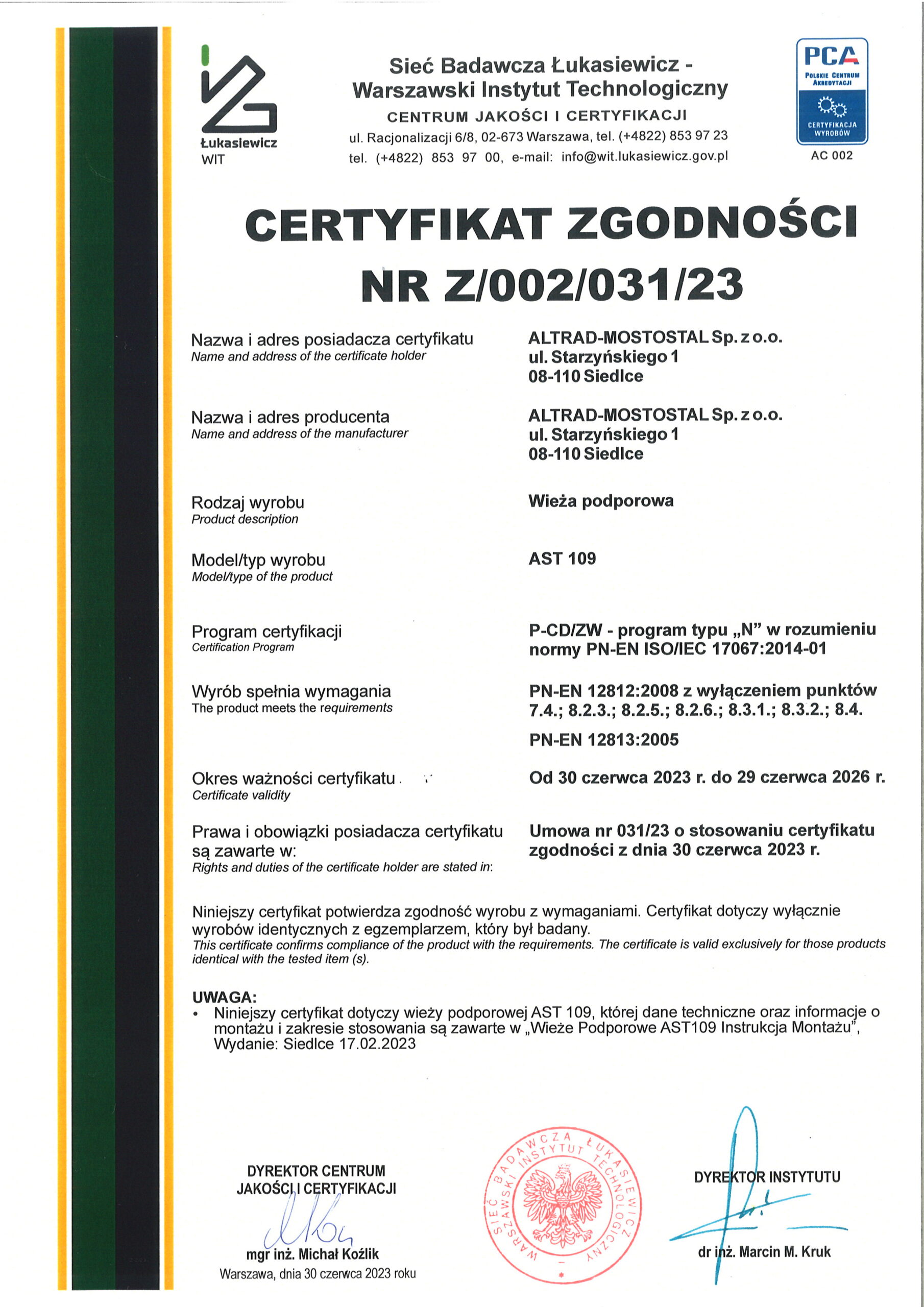 Certyfikaty Certyfikat ISO 90012000 Certyfikat spawalniczy stal Certyfikat spawalniczy aluminium Certyfikat bezpieczeństwa Alurotax Certyfikat bezpieczeństwa Plettac SL-70 Certyfikat zgodności Wieże AST109 Certyfikat rusztowania modułowe Rotax Plus_SE Certyfikat rusztowania ramowe Mostostal_Plus_SE Certyfikat rusztowania ramowe Mostostal_Plus_PL Certyfikat rusztowania Rotax Plus_PL Certyfikat rusztowania przejezdne MP
